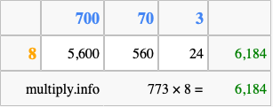 Below is an illustration showing you how to calculate 773 times 8 using the box method, using the instructions above.