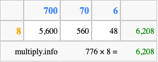 Below is an illustration showing you how to calculate 776 times 8 using the box method, using the instructions above.