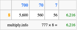 That's all there is to it! As you can see from the box above, the answer to 777 times 8 using the box method is 6,216.