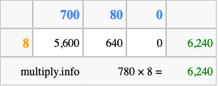 Below is an illustration showing you how to calculate 780 times 8 using the box method, using the instructions above.