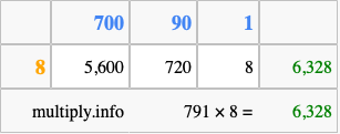 Below is an illustration showing you how to calculate 791 times 8 using the box method, using the instructions above.