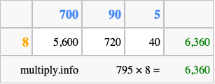Finally, we add up all the sums we found in step 3 to get our final answer to 795 times 8.