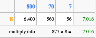 That's all there is to it! As you can see from the box above, the answer to 877 times 8 using the box method is 7,016.