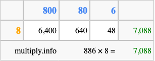 That's all there is to it! As you can see from the box above, the answer to 886 times 8 using the box method is 7,088.