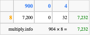 That's all there is to it! As you can see from the box above, the answer to 904 times 8 using the box method is 7,232.