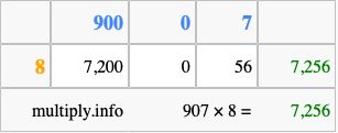 That's all there is to it! As you can see from the box above, the answer to 907 times 8 using the box method is 7,256.