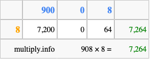 That's all there is to it! As you can see from the box above, the answer to 908 times 8 using the box method is 7,264.