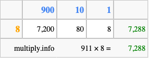 Finally, we add up all the sums we found in step 3 to get our final answer to 911 times 8.