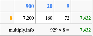 Below is an illustration showing you how to calculate 929 times 8 using the box method, using the instructions above.