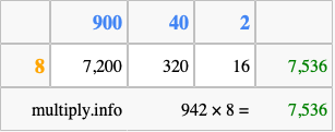 Finally, we add up all the sums we found in step 3 to get our final answer to 942 times 8.