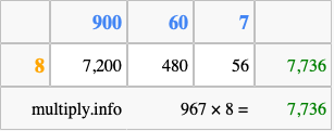 Finally, we add up all the sums we found in step 3 to get our final answer to 967 times 8.