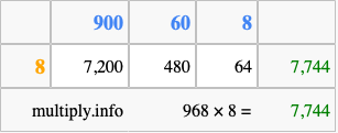 That's all there is to it! As you can see from the box above, the answer to 968 times 8 using the box method is 7,744.