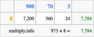 That's all there is to it! As you can see from the box above, the answer to 973 times 8 using the box method is 7,784.