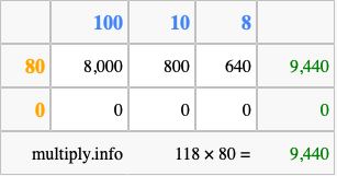 That's all there is to it! As you can see from the box above, the answer to 118 times 80 using the box method is 9,440.