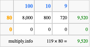 Below is an illustration showing you how to calculate 119 times 80 using the box method, using the instructions above.