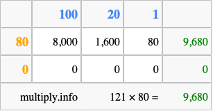 Below is an illustration showing you how to calculate 121 times 80 using the box method, using the instructions above.