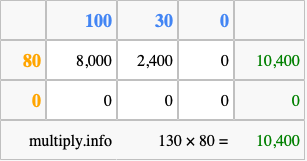 Below is an illustration showing you how to calculate 130 times 80 using the box method, using the instructions above.