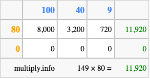Finally, we add up all the sums we found in step 3 to get our final answer to 149 times 80.
