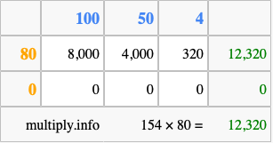 Finally, we add up all the sums we found in step 3 to get our final answer to 154 times 80.