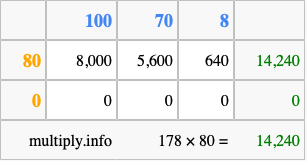 That's all there is to it! As you can see from the box above, the answer to 178 times 80 using the box method is 14,240.