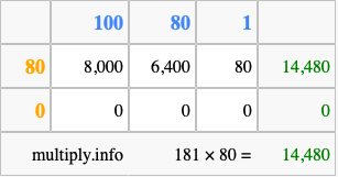 Finally, we add up all the sums we found in step 3 to get our final answer to 181 times 80.