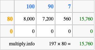 Finally, we add up all the sums we found in step 3 to get our final answer to 197 times 80.
