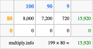 Below is an illustration showing you how to calculate 199 times 80 using the box method, using the instructions above.