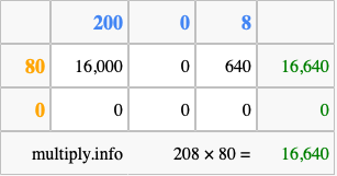 Below is an illustration showing you how to calculate 208 times 80 using the box method, using the instructions above.