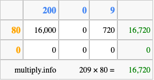 That's all there is to it! As you can see from the box above, the answer to 209 times 80 using the box method is 16,720.