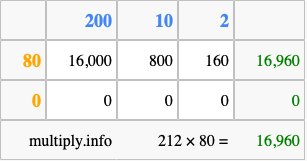 That's all there is to it! As you can see from the box above, the answer to 212 times 80 using the box method is 16,960.