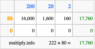 Finally, we add up all the sums we found in step 3 to get our final answer to 222 times 80.