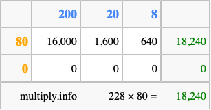 Below is an illustration showing you how to calculate 228 times 80 using the box method, using the instructions above.