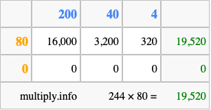 That's all there is to it! As you can see from the box above, the answer to 244 times 80 using the box method is 19,520.