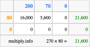 Finally, we add up all the sums we found in step 3 to get our final answer to 270 times 80.