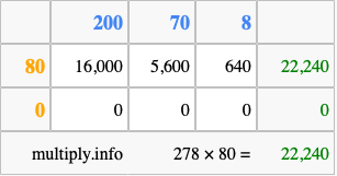 Finally, we add up all the sums we found in step 3 to get our final answer to 278 times 80.