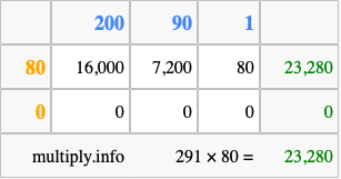 Finally, we add up all the sums we found in step 3 to get our final answer to 291 times 80.