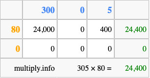 Below is an illustration showing you how to calculate 305 times 80 using the box method, using the instructions above.