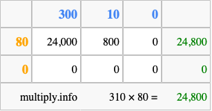 Below is an illustration showing you how to calculate 310 times 80 using the box method, using the instructions above.