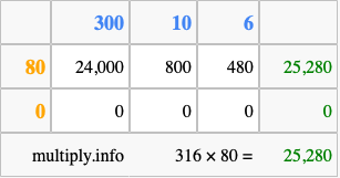 Finally, we add up all the sums we found in step 3 to get our final answer to 316 times 80.