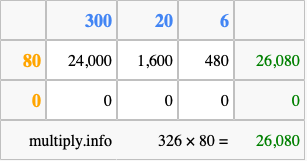 Finally, we add up all the sums we found in step 3 to get our final answer to 326 times 80.