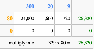 Finally, we add up all the sums we found in step 3 to get our final answer to 329 times 80.