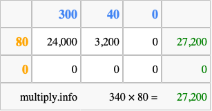 Finally, we add up all the sums we found in step 3 to get our final answer to 340 times 80.