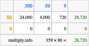 Finally, we add up all the sums we found in step 3 to get our final answer to 359 times 80.