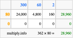 Finally, we add up all the sums we found in step 3 to get our final answer to 362 times 80.