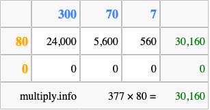 Below is an illustration showing you how to calculate 377 times 80 using the box method, using the instructions above.