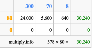 That's all there is to it! As you can see from the box above, the answer to 378 times 80 using the box method is 30,240.