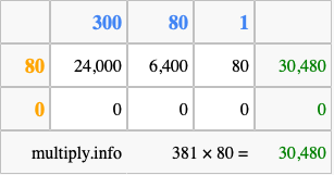 Finally, we add up all the sums we found in step 3 to get our final answer to 381 times 80.