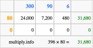 Below is an illustration showing you how to calculate 396 times 80 using the box method, using the instructions above.