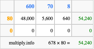 Finally, we add up all the sums we found in step 3 to get our final answer to 678 times 80.