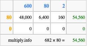 That's all there is to it! As you can see from the box above, the answer to 682 times 80 using the box method is 54,560.